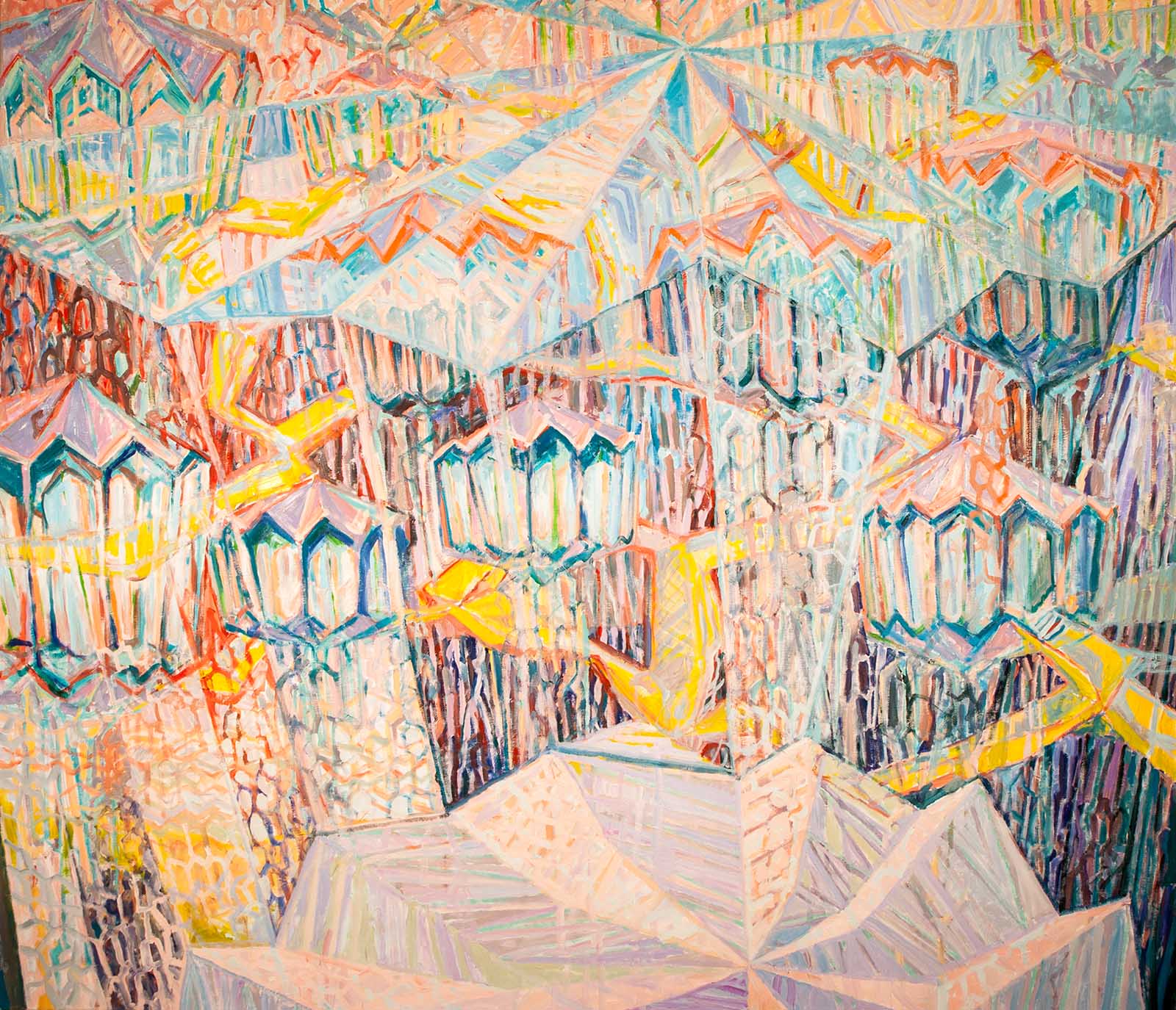 angedeutet wird und sich in einem Meer aus Farben und Formen aufzulösen scheint.