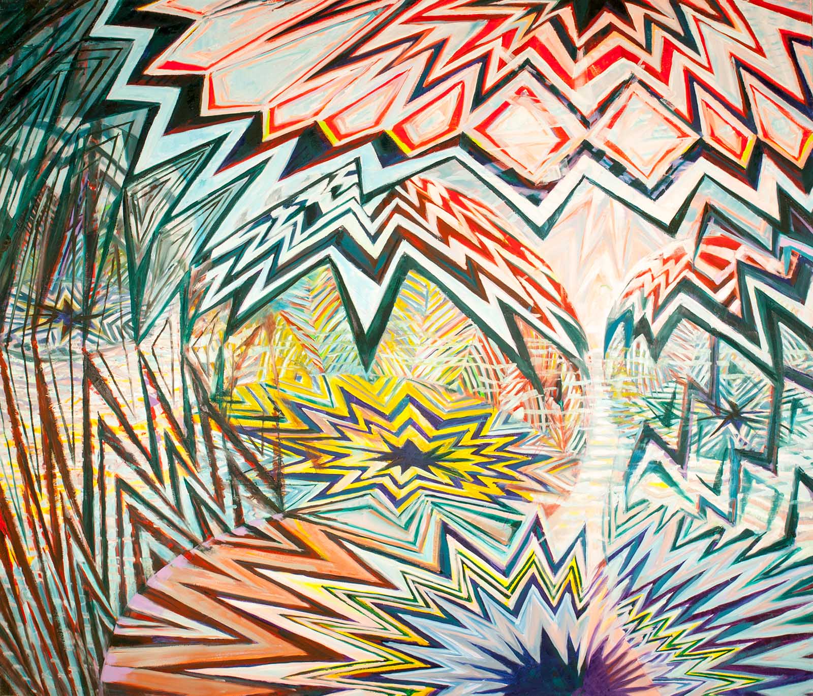 Zackige Linien und leuchtende Farben, die von mehreren Zentren auszugehen scheinen, erzeugen ein Bild von kraftvoller Dynamik und ungebändigter Energie. Die Komposition wirkt wie eine Momentaufnahme.