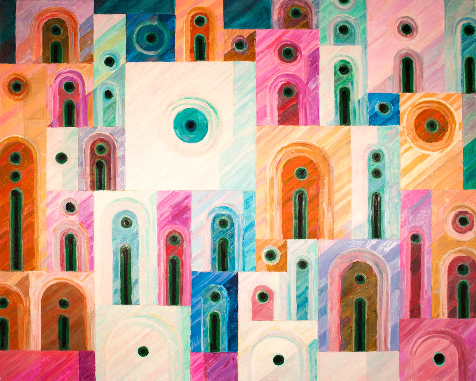 Das Gemälde zeigt eine Vielzahl von stilisierten Fenstern und Bögen, die in einem sich