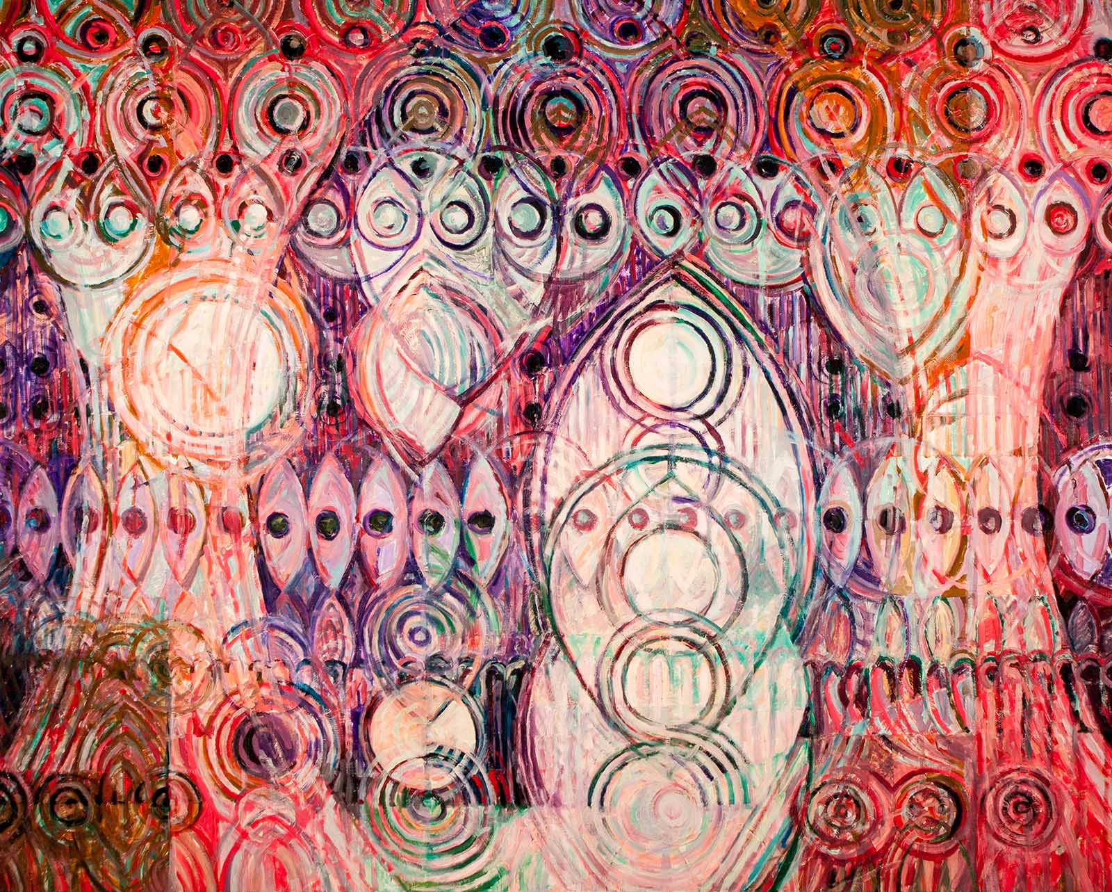 Das Gemälde entfaltet eine dynamische Komposition aus ineinandergreifenden Kreisen, elliptischen Mustern und überlagernden Formen. Durch die nuancierten Kontraste von warmen Rottönen, kraftvollen Violetttönen und kühlen Grüntönen entsteht ein pulsierendes Spiel von Tiefe und Bewegung. Die wiederkehrenden Augenmotive und konzentrischen Formen scheinen sich wie unaufhörliche Wellen durch ein grenzenloses Raum-Zeit-Geflecht auszubreiten. Es lassen sich Anklänge an strahlende Lichter, schillernde Flügelschläge oder ein pulsierendes Universum erahnen, das sich der Definition entzieht. Die dichte Schichtung der Pinselstriche fängt den Moment kosmischer Harmonie ein, während die Komposition ein gewagtes Gleichgewicht zwischen Chaos und Ordnung wahrt.