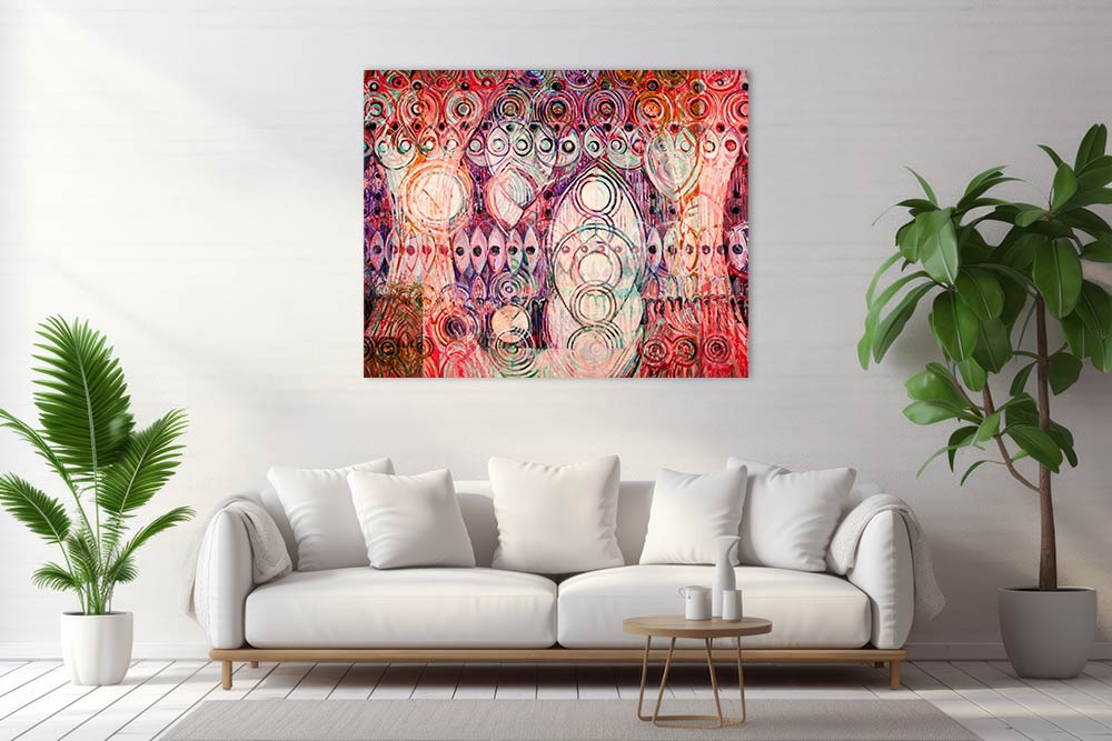 Das Gemälde entfaltet eine dynamische Komposition aus ineinandergreifenden Kreisen, elliptischen Mustern und überlagernden Formen. Durch die nuancierten Kontraste von warmen Rottönen, kraftvollen Violetttönen und kühlen Grüntönen entsteht ein pulsierendes Spiel von Tiefe und Bewegung. Die wiederkehrenden Augenmotive und konzentrischen Formen scheinen sich wie unaufhörliche Wellen durch ein grenzenloses Raum-Zeit-Geflecht auszubreiten. Es lassen sich Anklänge an strahlende Lichter, schillernde Flügelschläge oder ein pulsierendes Universum erahnen, das sich der Definition entzieht. Die dichte Schichtung der Pinselstriche fängt den Moment kosmischer Harmonie ein, während die Komposition ein gewagtes Gleichgewicht zwischen Chaos und Ordnung wahrt.