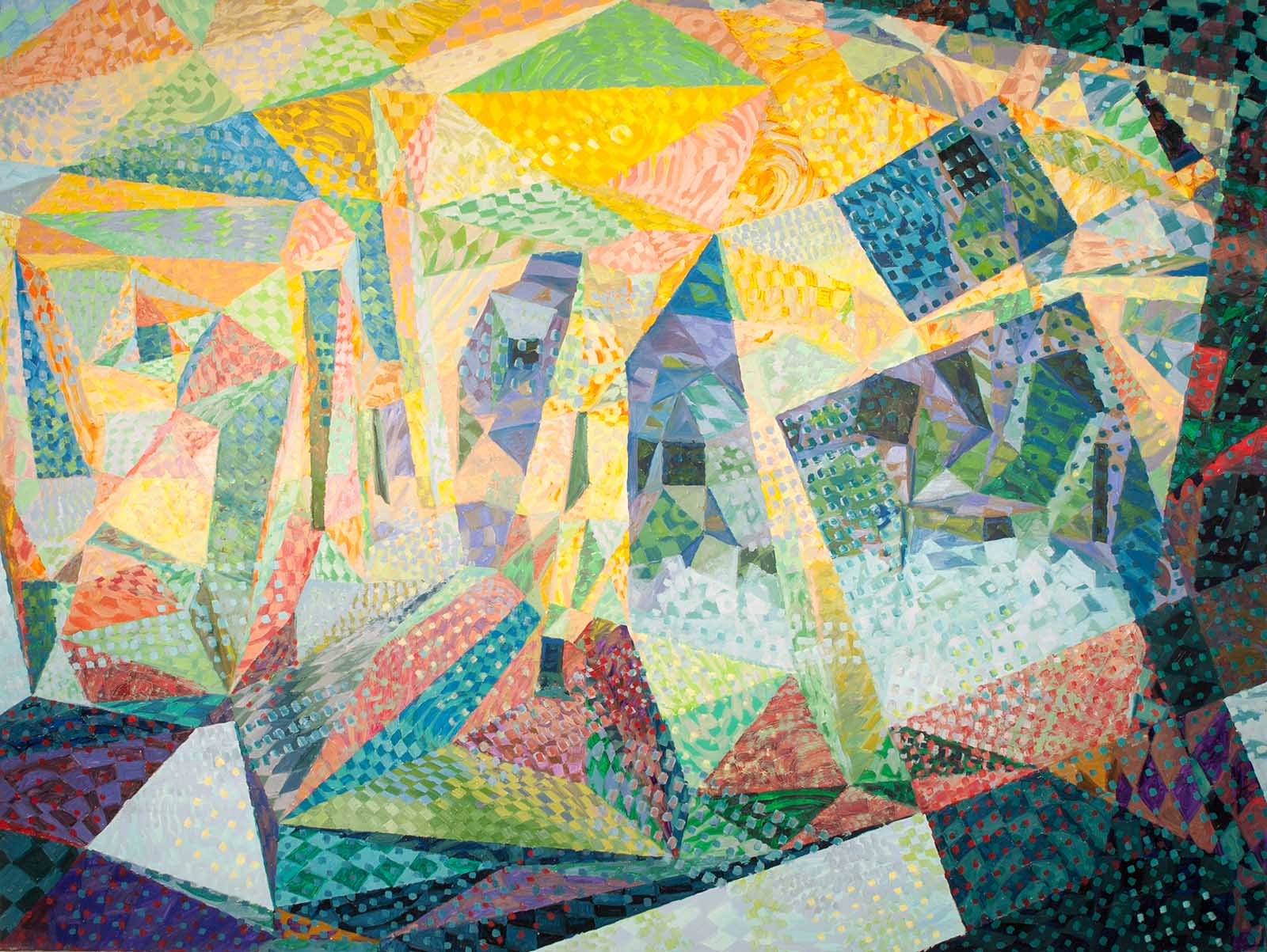 Ein scheinbar chaotisches Arrangement aus Dreiecken und anderen geometrischen Formen in leuchtenden Farben, das bei näherer Betrachtung eine verborgene Ordnung offenbart. Gegensätze ziehen sich an.