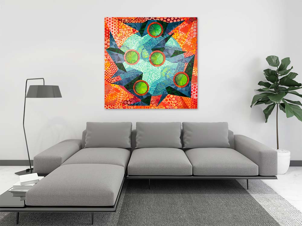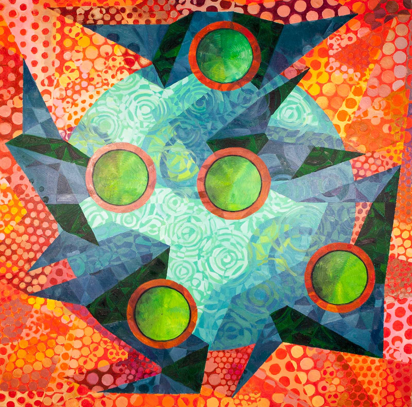 durchscheinen lassen. Fünf grüne Kreise, eingefasst von roten Ringen, sind über