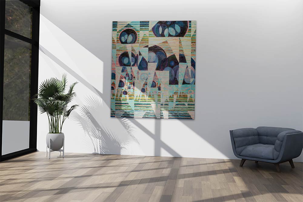In diesem faszinierenden Werk verschmelzen geometrische Kreise mit perlenden Lichtreflexen zu einer rhythmischen Komposition aus Raum und Zeit. Die horizontalen Streifen im Hintergrund erzeugen eine vibrierende Dynamik, während die schwebenden blauen Kreisformen wie Zeitfenster in andere Dimensionen erscheinen.