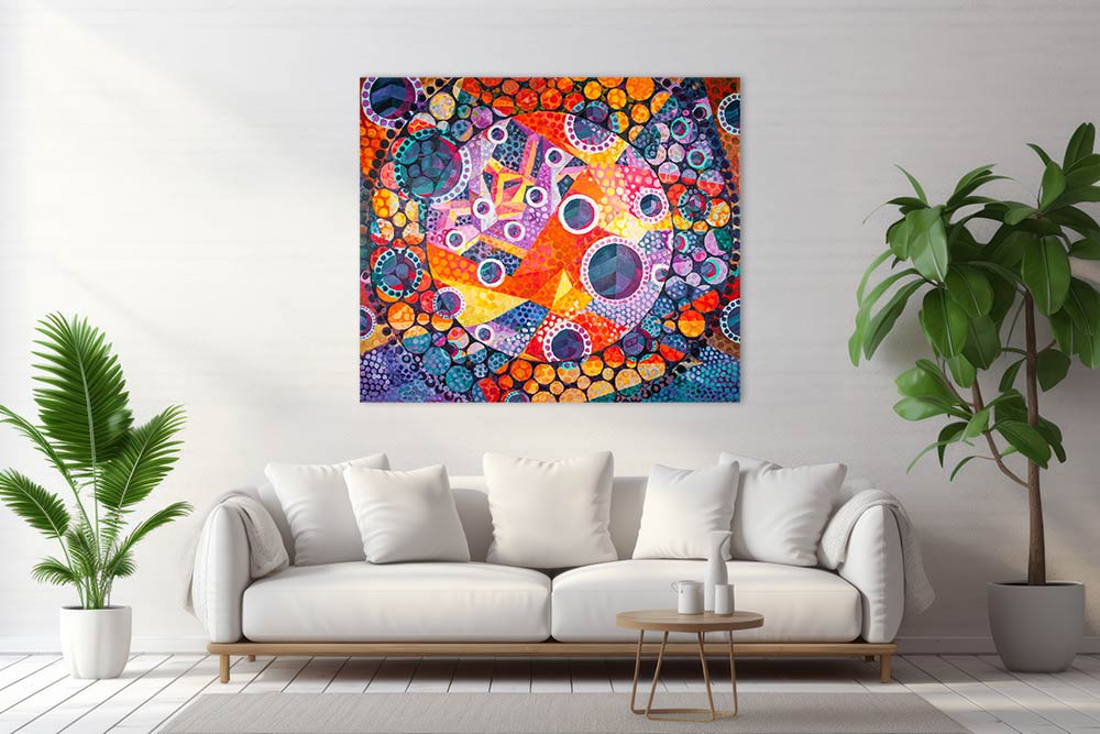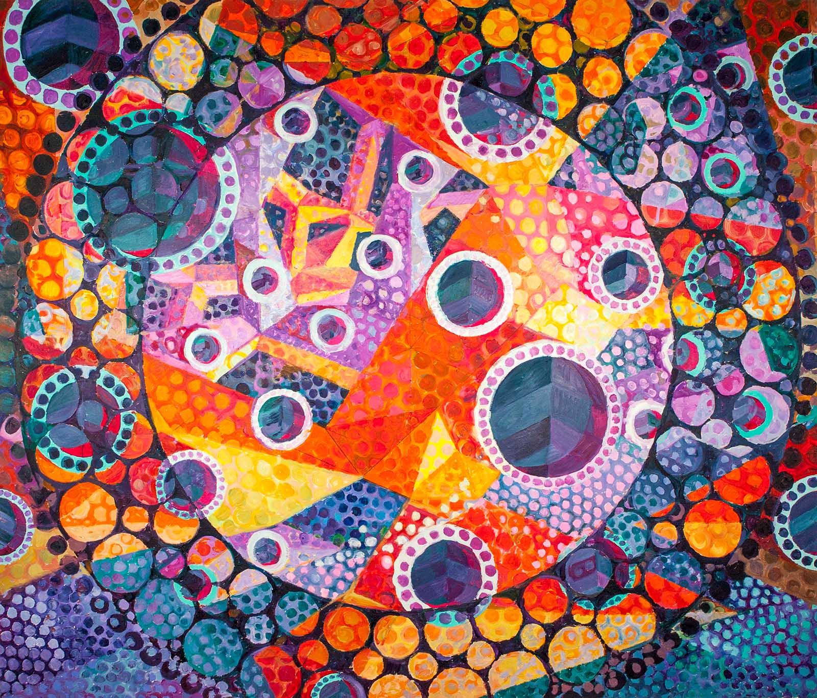 ineinandergreifenden Kreisen, Dreiecken und unregelmäßigen Formen besteht. Die