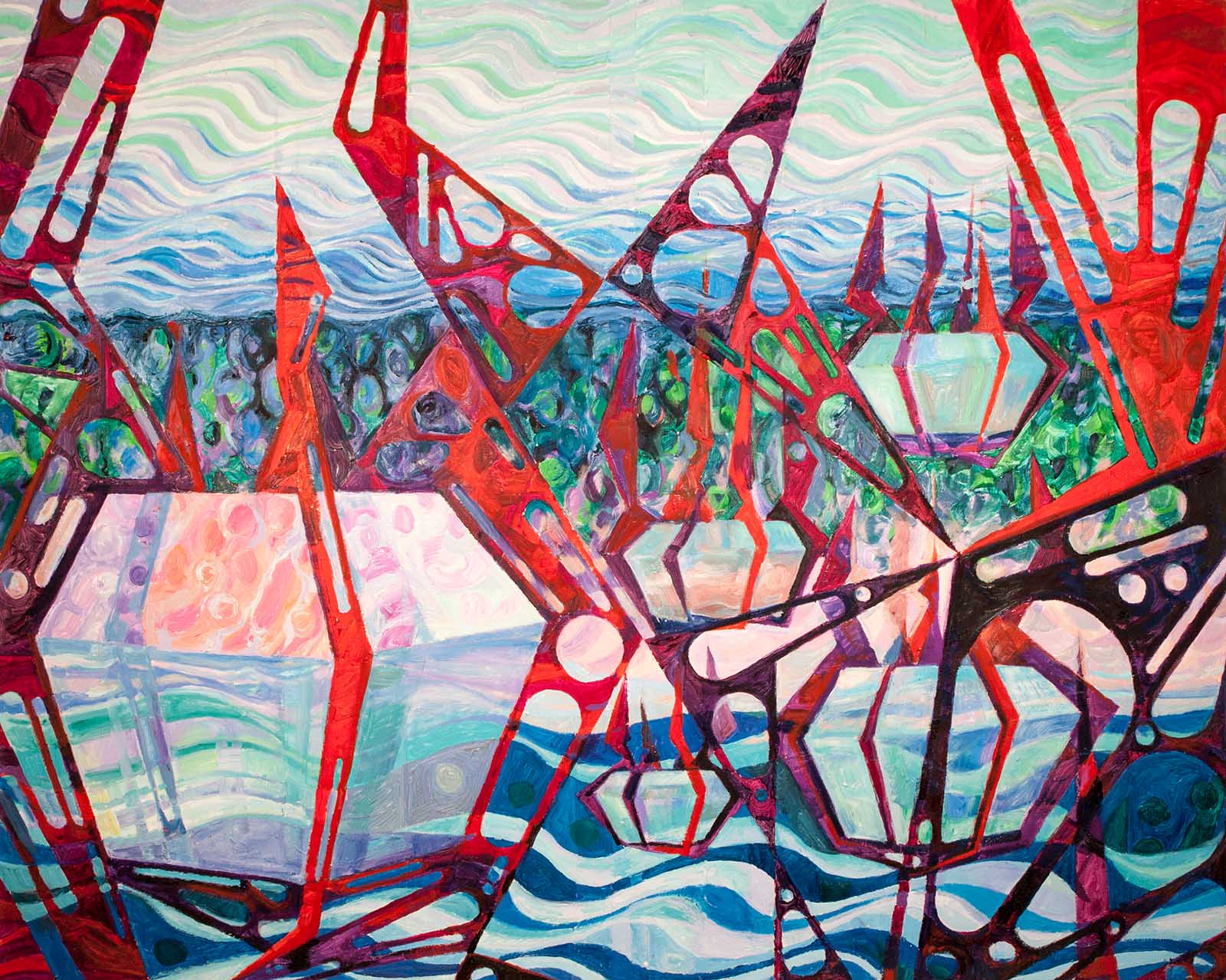 In diesem Werk wird der Himmel in Fragmente aufgelöst, als ob er in einem Prisma aus Licht zersplittert wäre. Rote, fast architektonische Strukturen ragen wie filigrane Gerüste empor, ihre scharfen Kanten von einer weichen, wellenförmigen Dynamik umspielt. Die grün-blauen Farbflächen erinnern an Wasser oder eine fließende Landschaft, die zugleich Tiefe und Leichtigkeit vermittelt. Es ist eine fragile Balance zwischen Chaos und Ordnung, in der sich die einzelnen Elemente zu einem pulsierenden Gesamtgefüge verweben. Der Betrachter bleibt eingeladen, in die Tiefenschichten von Reflexionen und Brechungen einzutauchen und seine eigene Bedeutung zu erschaffen.