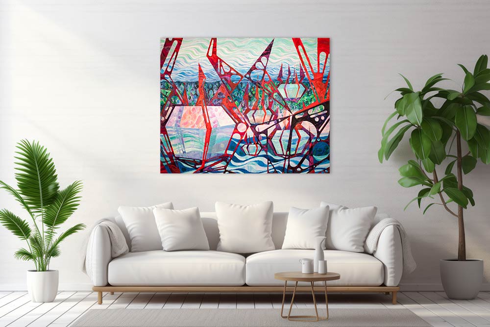 In diesem Werk wird der Himmel in Fragmente aufgelöst, als ob er in einem Prisma aus Licht zersplittert wäre. Rote, fast architektonische Strukturen ragen wie filigrane Gerüste empor, ihre scharfen Kanten von einer weichen, wellenförmigen Dynamik umspielt. Die grün-blauen Farbflächen erinnern an Wasser oder eine fließende Landschaft, die zugleich Tiefe und Leichtigkeit vermittelt. Es ist eine fragile Balance zwischen Chaos und Ordnung, in der sich die einzelnen Elemente zu einem pulsierenden Gesamtgefüge verweben. Der Betrachter bleibt eingeladen, in die Tiefenschichten von Reflexionen und Brechungen einzutauchen und seine eigene Bedeutung zu erschaffen.