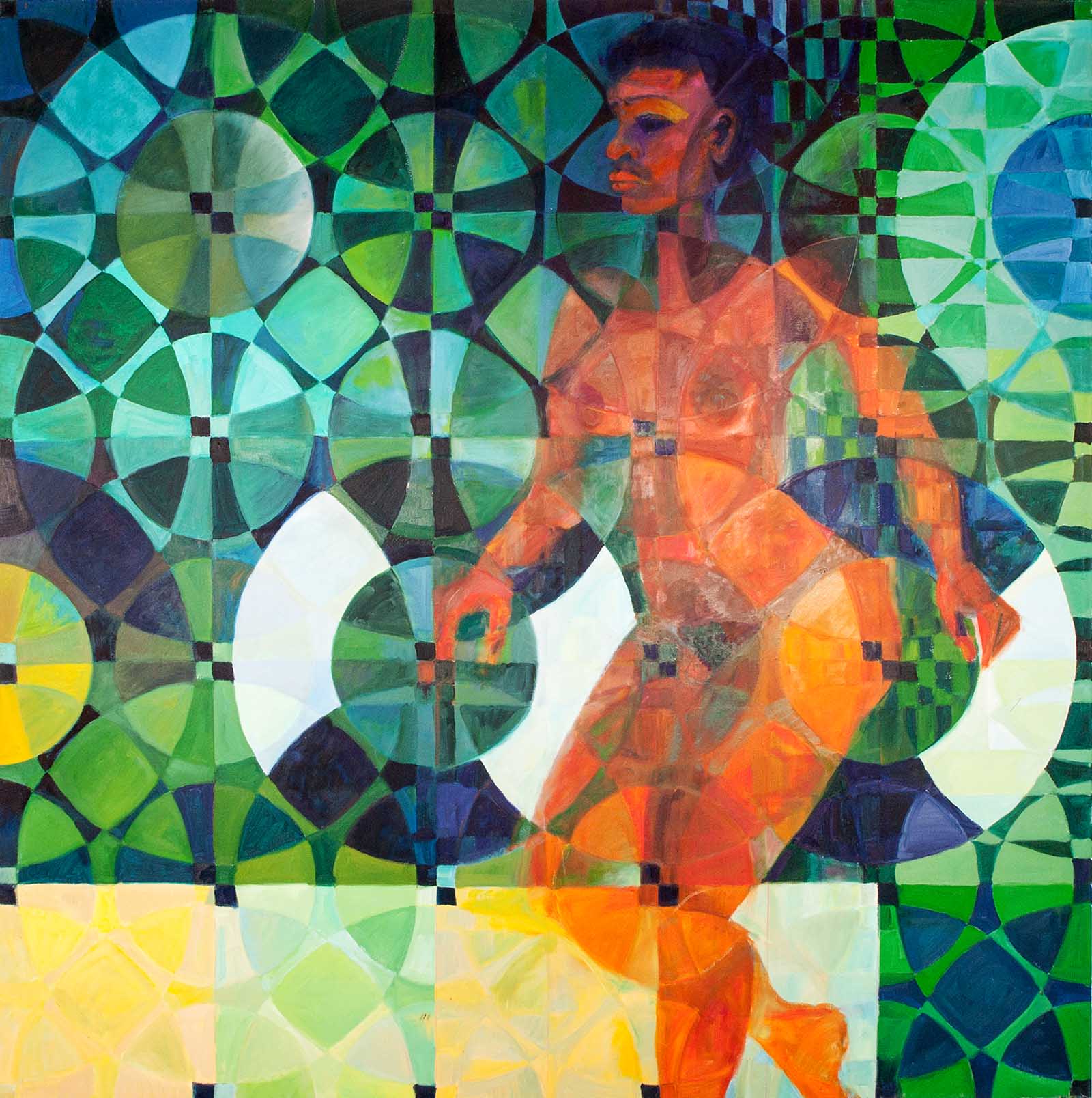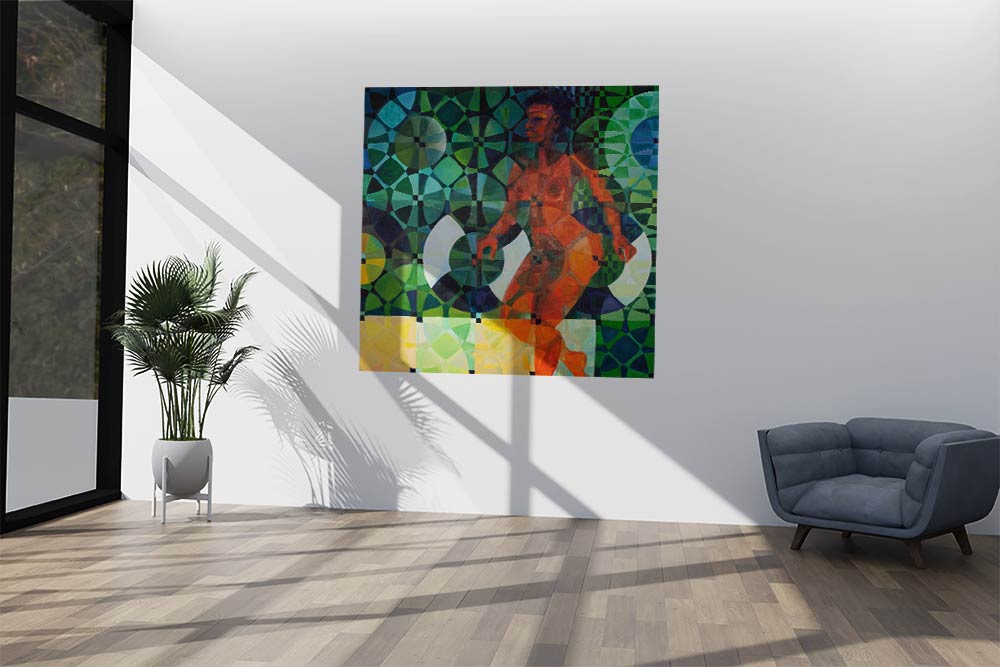 Das Gemälde zeigt eine menschliche Figur, die sich in einer dynamischen, fast