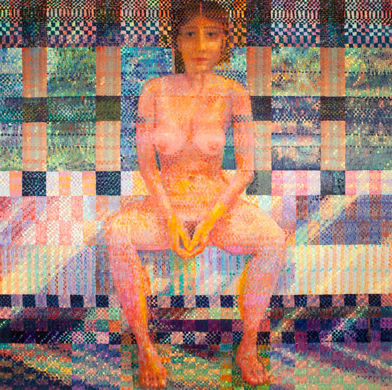 Das Gemälde zeigt eine sitzende, nackte weibliche Figur, die frontal dem Betrachter