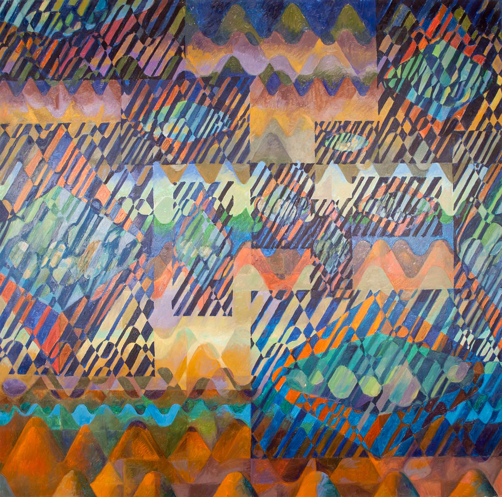 Dreiecken, Rauten, Rechtecken – und feinen Gittermustern überlagert, wodurch eine