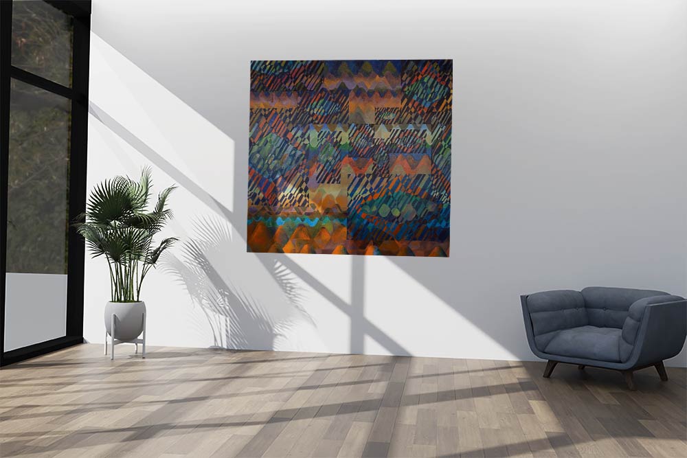 Sich überlagernde Muster aus wellenförmigen Linien und geometrischen Formen in unterschiedlichen Farben erzeugen eine komplexe, vielschichtige Komposition. Der Betrachter wird mit der Idee einer visuellen Polyphonie konfrontiert, bei der verschiedene "Stimmen" oder Muster gleichzeitig erklingen und miteinander interagieren.