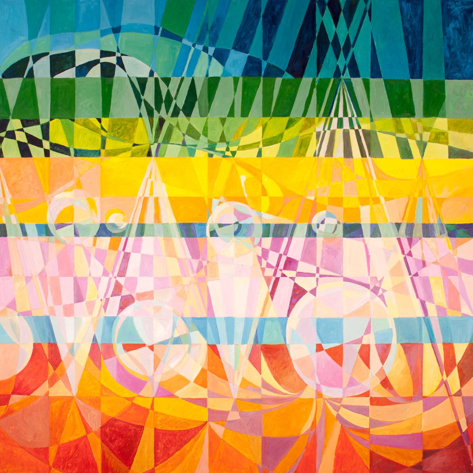 den Eindruck eines stilisierten Horizonts, an dem Himmel und Erde aufeinandertreffen. Diese Farbstreifen werden von geometrischen Formen –