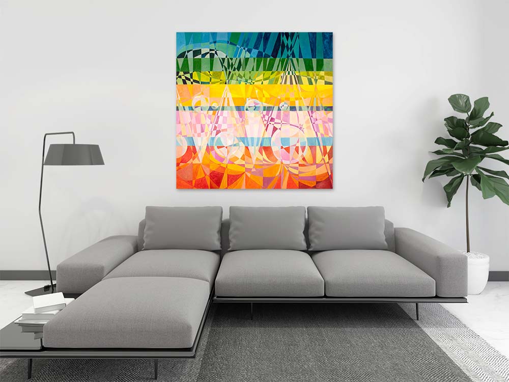 den Eindruck eines stilisierten Horizonts, an dem Himmel und Erde aufeinandertreffen. Diese Farbstreifen werden von geometrischen Formen –